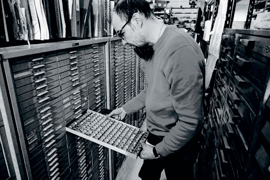 Jari Romppanen esittelee hyllyä, jossa on pienissä purkeissä erilaisia Omegan ruuveja.